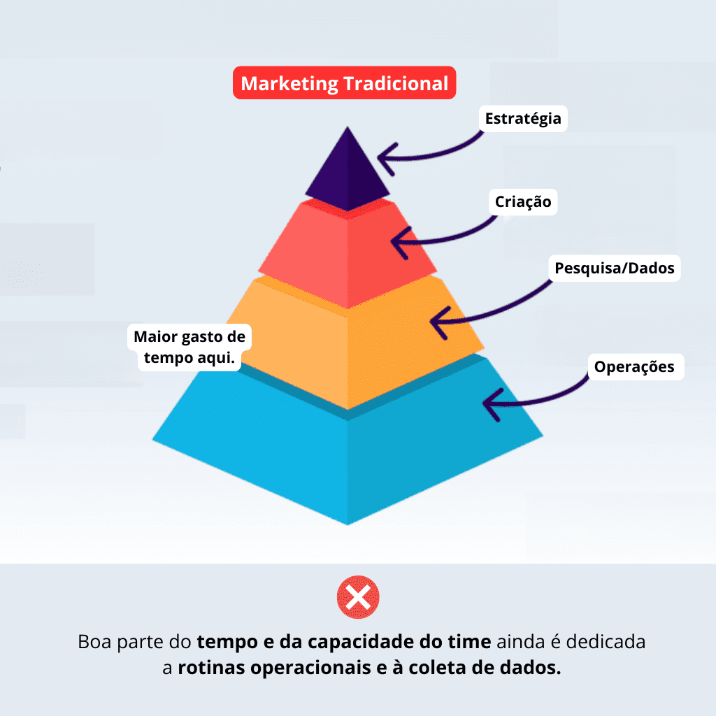 O CAPEX da sua empresa está sendo drenado por um inimigo silencioso: a ineficiência operacional no marketing. Por anos, a estrutura foi a mesma: um exército de profissionais gastando 80% do tempo em tarefas manuais na base da pirâmide – pesquisa, coleta de dados e operações – para só então, com o tempo e os recursos restantes, pensar em estratégia.